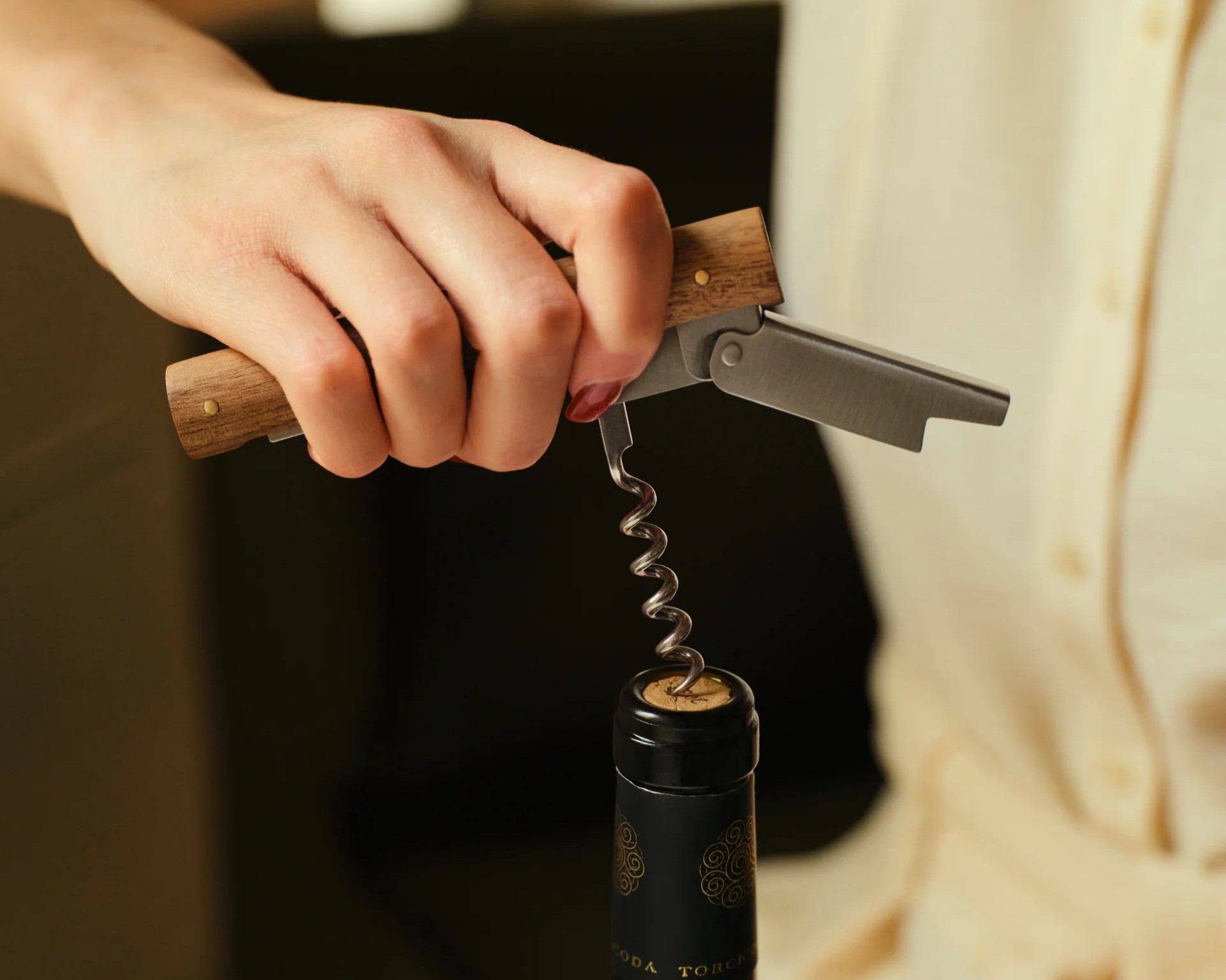 Open your wine in style. Made with sustainable walnut and with elegant brass details, this handmade and multi-functional corkscrew is built to last years.